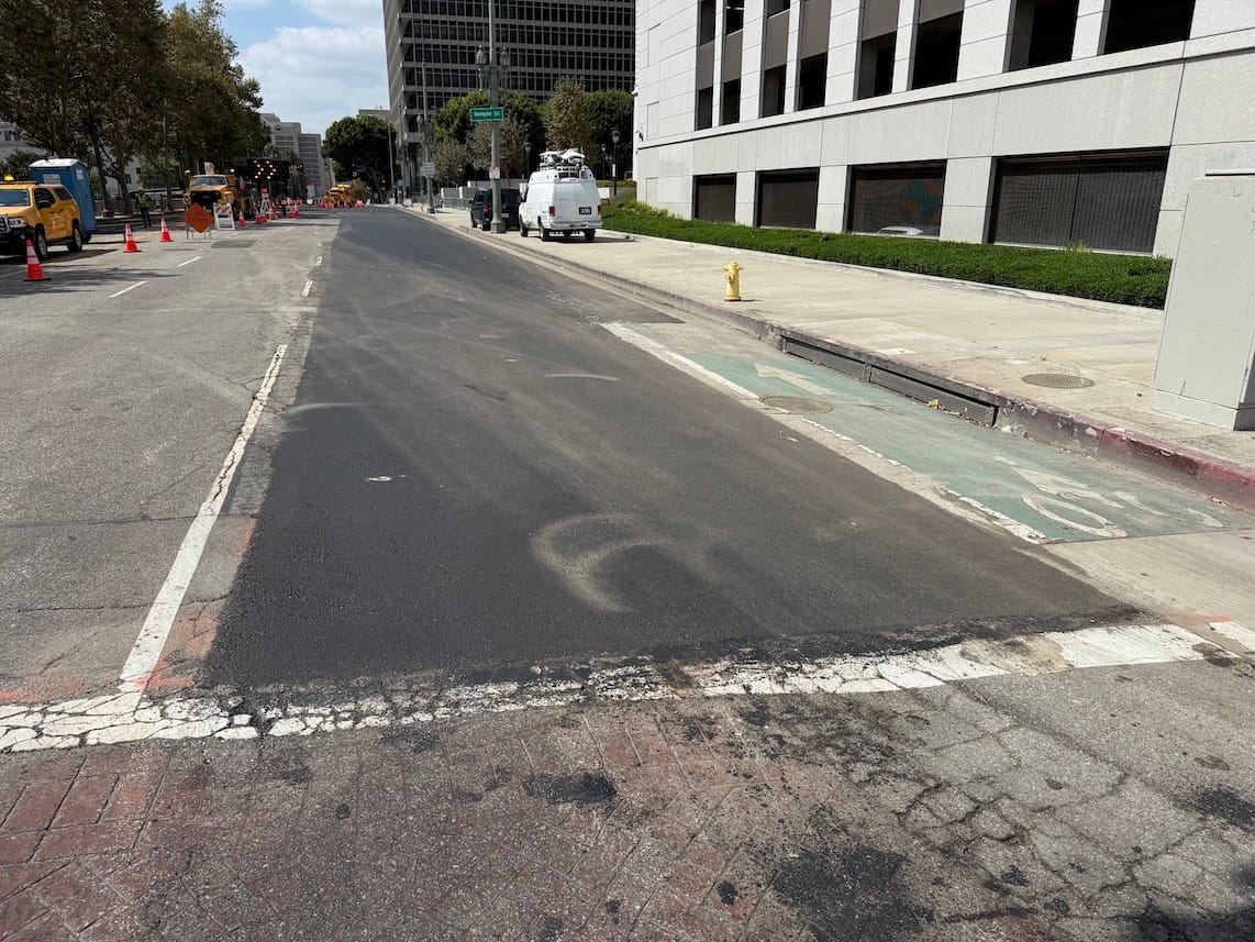Last year, the city resurfaced 312 lane miles and slurry sealed 761 lane miles. What are they going to do next year with all the money they save from doing way less? StreetsLA is proposing instead to do 1,000 “large asphalt repairs.” StreetsLA defines large asphalt repair as “a pavement maintenance activity that addresses localized but significant damage to asphalt streets, typically larger than a standard pothole repair, but smaller than full resurfacing or reconstruction.” Basically, it involves repaving only part of a street, not the entire width. Here is an example of a large asphalt repair the city did on Spring St. in September: